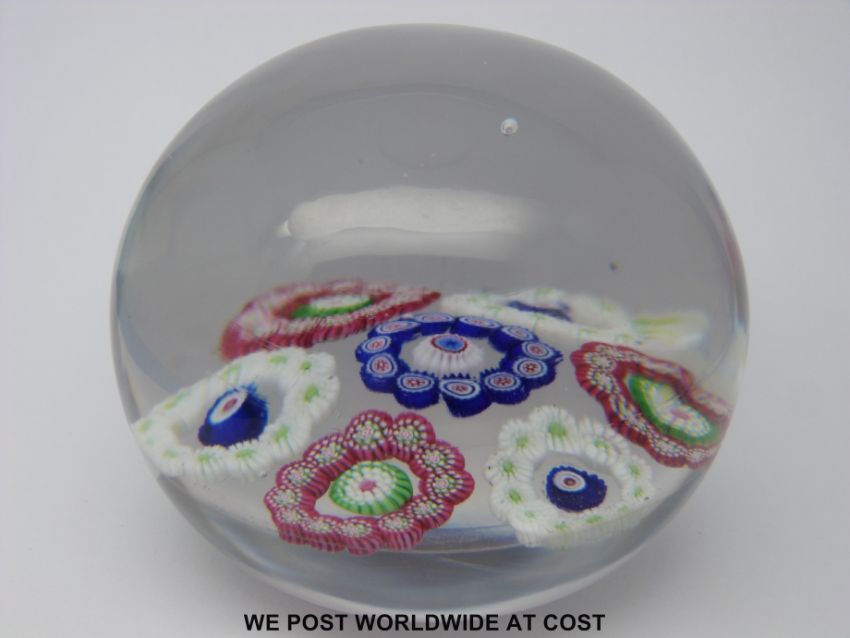 Clichy patterned millefiori glass paperweight with seven rings of multicoloured canes around further central canes, 8cm diameter.