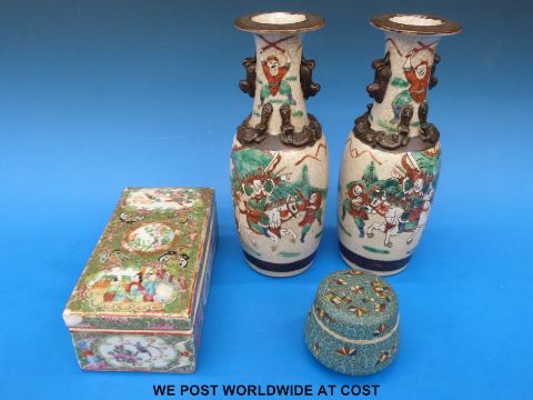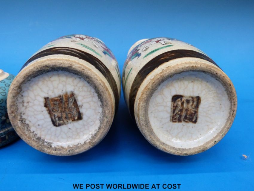 A pair of Chinese crackle vases together with a Canton famille rose box and a Japanese cloisonne jar