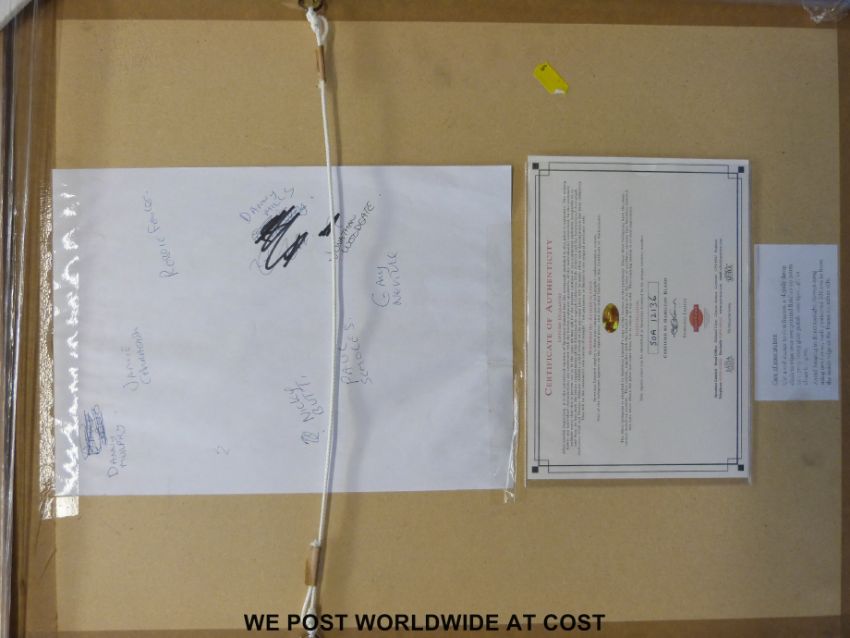 An England football pendant signed by nine players including Gary Neville, Paul Scholes, Nicky Butt, Robbie Fowler, Danny Murphy, Jamie Carragher, Danny Mills and Jonathan Woodgate framed and glazed with certificate of authenticity