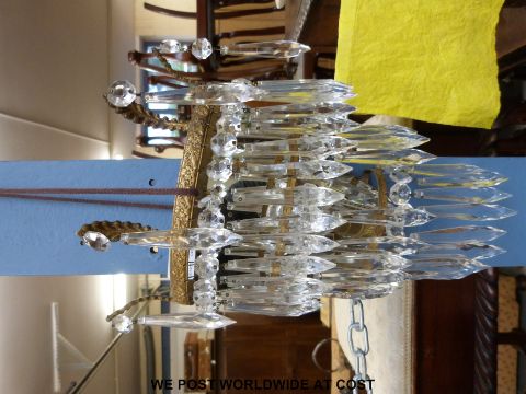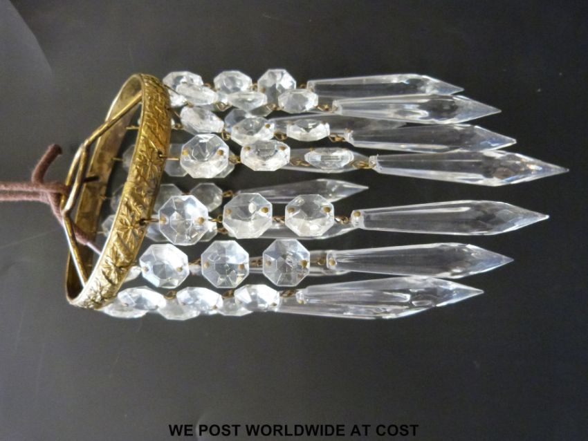 A set of three gilt metal wall mounted light shades with crystal drop lustres