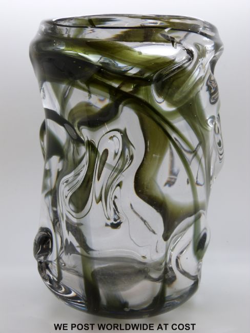 William Wilson and Harry Dyer for Whitefriars green streaky Knobbly glass vase, shape number 9608 (20.5cm tall)