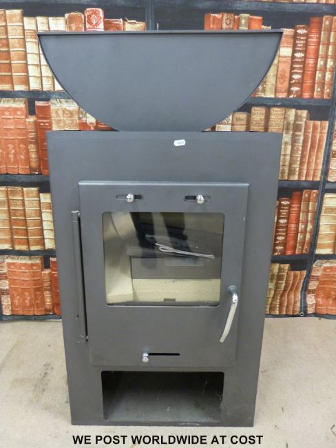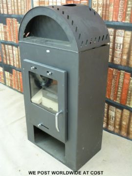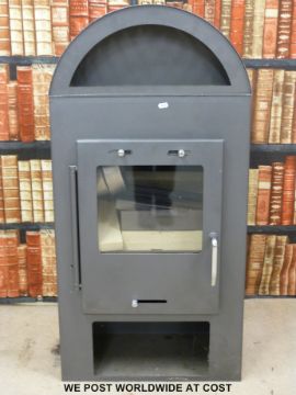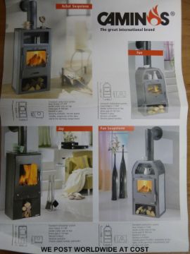 A modern unused Caminos wood burning stove, with firebricks and accessories (modern style)
