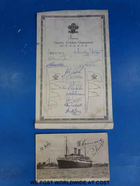 Surrey County Cricket champions 1952 - 58 signed cards with 13 signatures including Peter May, Mickey Stewart, Ken Barrington, John Edrich, Tony Lock, Ron Tindall etc, together with a postcard of the Orient Line, SS Otranto signed by Jak Hobbs, Harold Larwood and one other from the 1932-33 MCC tour of Australia known as "The Body Line Tour"