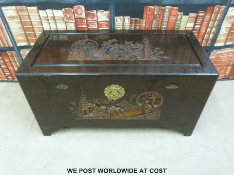 An Oriental blanket chest with carved decoration (W93cm D45cm H50cm)