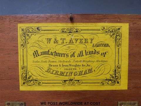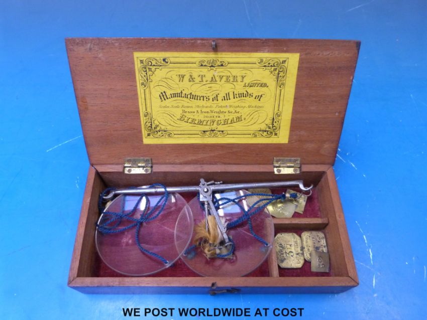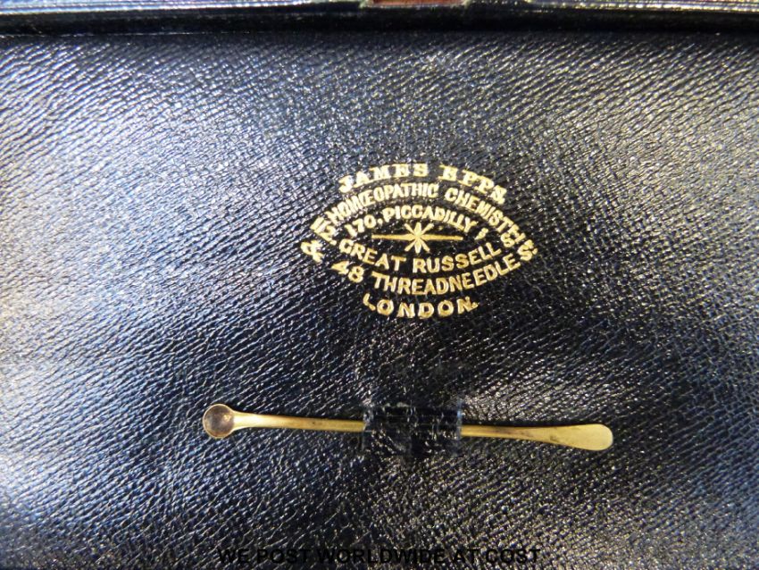 Cased homeopathic bottles with brass scoop by James Epps, 170 Piccadilly, 112 Russell St and 48 Threadneedle St. London together with a set of Avery cased pharmacy scales