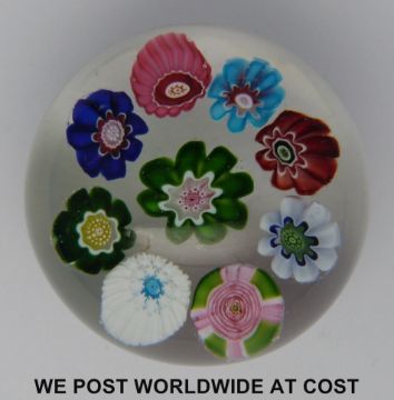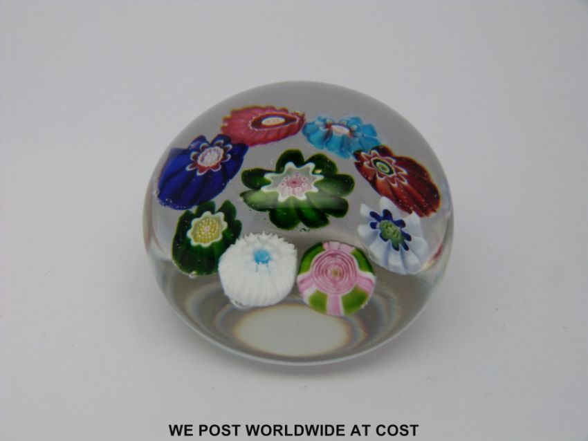Clichy spaced millefiori glass paperweight with nine various canes including a signature pink, green and white rose, 4.7cm diameter.