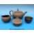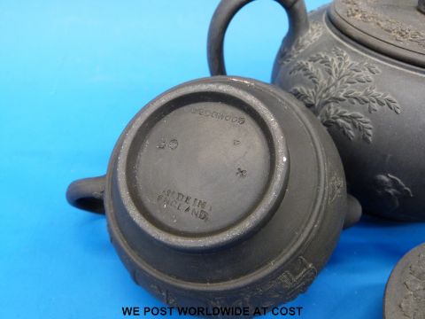 A Wedgwood black basalt figural teapot, sugar and milk jug