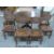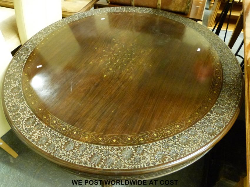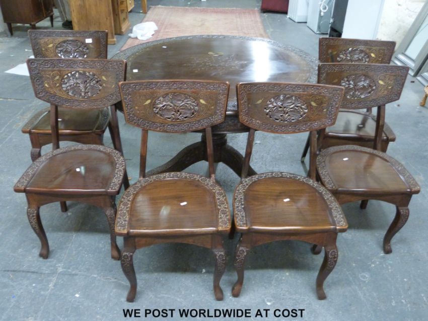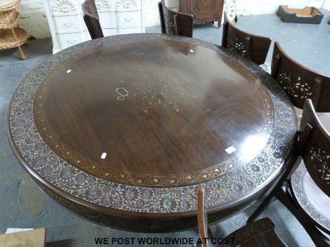 A brass inlaid and carved circular Northern Indian hardwood table raised on a tripod base(height 75cm diameter 130cm) together with six matching chairs