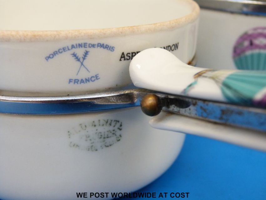 A collection of retro ceramic Limoges Aluminite Frugier saucepans with hot air balloon decoration, retailed by Asprey London