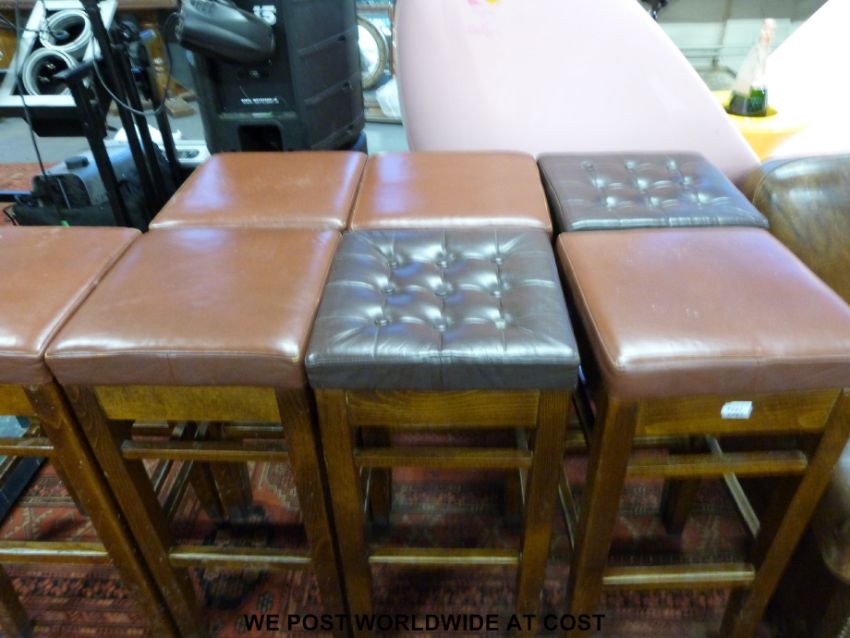Seven faux leather and oak barn stools