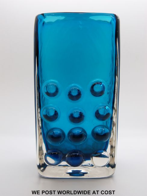 Geoffrey Baxter for Whitefriars kingfisher blue Mobile Phone glass vase, pattern number 9670 (16.3cm tall)