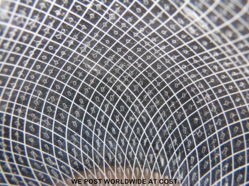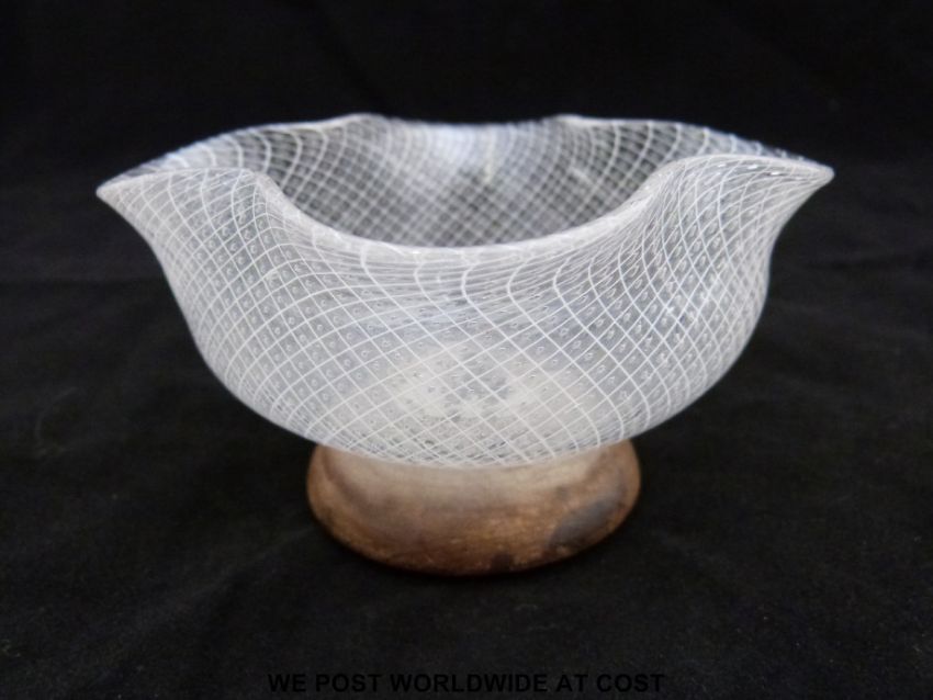 A Venetian glass bowl with latticino and control bubble decoration raised on later wooden base (5.5cm tall)