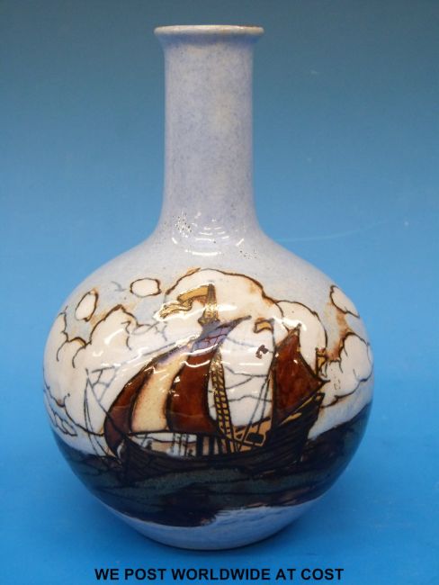 A Royal Doulton Art pottery vase decorated with galleons under sail, impressed WB probably for Winnie Bowstead (height 17.5cm)