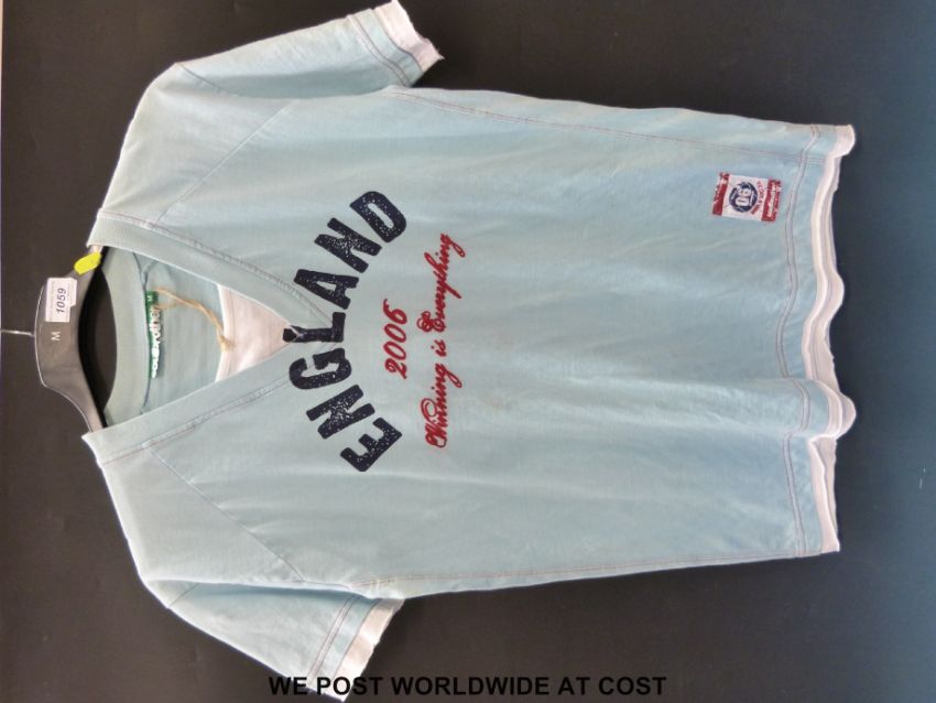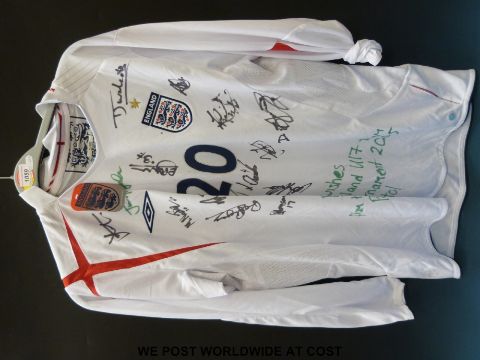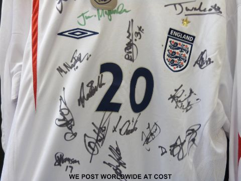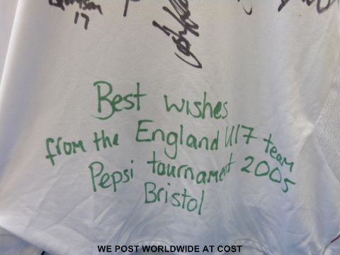 An England football shirt signed by 15 of the U21 team in 2005 together with three England t-shirts and two flags