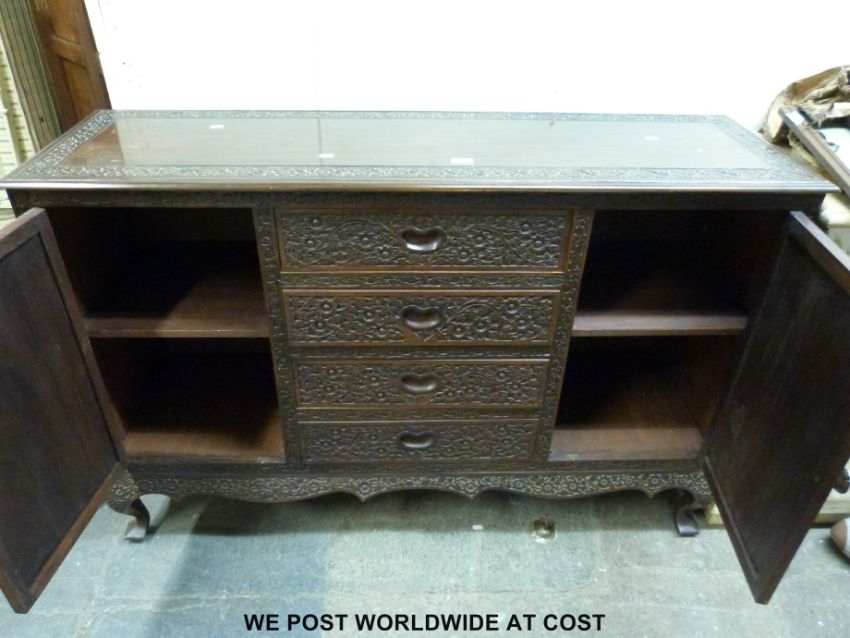A brass inlaid and carved Northern Indian sideboard with four straight drawers flanked by cupboards and raised on cabriole legs (H92 x D138 x W43cm)