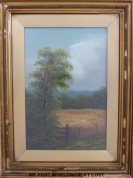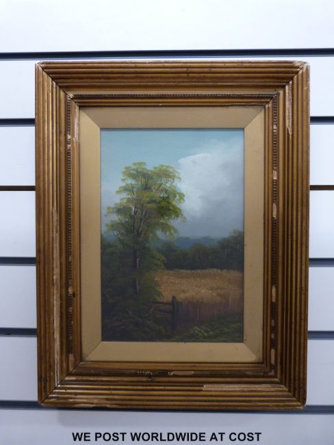 Oil on board cornfield and elm tree, indistinctly signed lower left possibly Connoley (28 x 19cm)