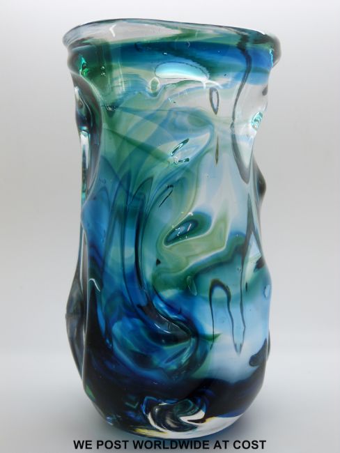William Wilson and Harry Dyer for Whitefriars Knobbly glass vase with blue and green decoration (19cm tall)