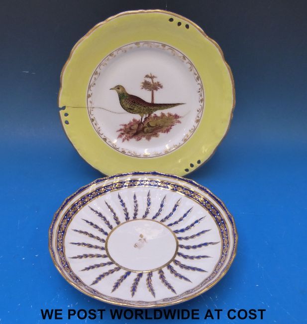 An early Derby saucer dish, marked with an initial and numbers to the side of the base and finely decorated with blue ferns, the inner border with small gold florets and white enamel dots on blue ground, circa 1782 - 1825, together with a yellow ribbon plate with a thrush painted in centre with yellow edge