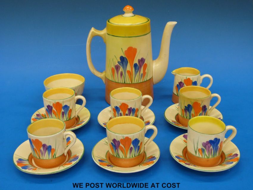 A Clarice Cliff Bizarre coffee set in the crocus pattern