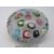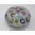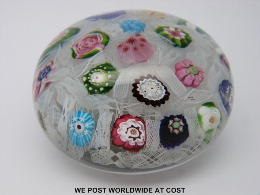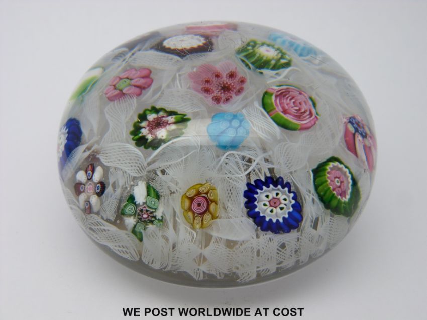 Clichy chequer glass paperweight with 18 various canes including a pink and green rose all on a bed of scrambled latticino tubes, old auction label to base '93 27 Jan 1975', 7.5cm in diameter.