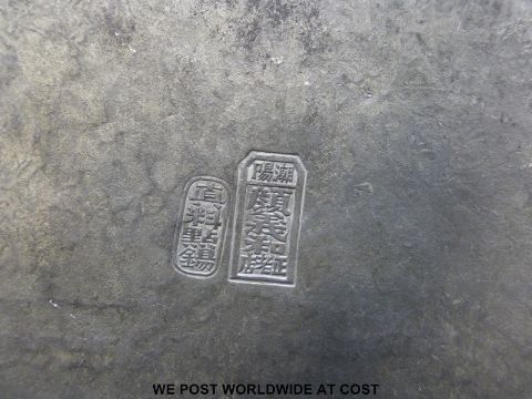 A 19thC Chinese Paktong tray engraved with Chinese court scene and signed to back (31cm long)