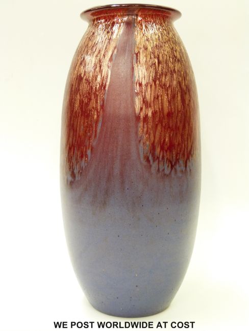 A large Monart glass vase of shouldered ovoid form with collared neck decorated with matt blue base and aventurine bronze flecks on a red ground (H42cm)