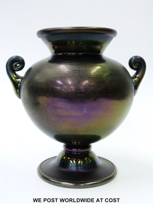A pair of Thomas Webb Christopher Dresser influence glass Bronze Ware vases having spherical bodies with flared collars and two scroll handles to the sides all on domed feet (H15.5cm)