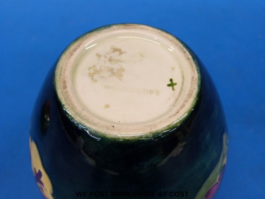A Moorcroft ginger jar and cover in Hibiscus pattern on a green ground (11cm tall)