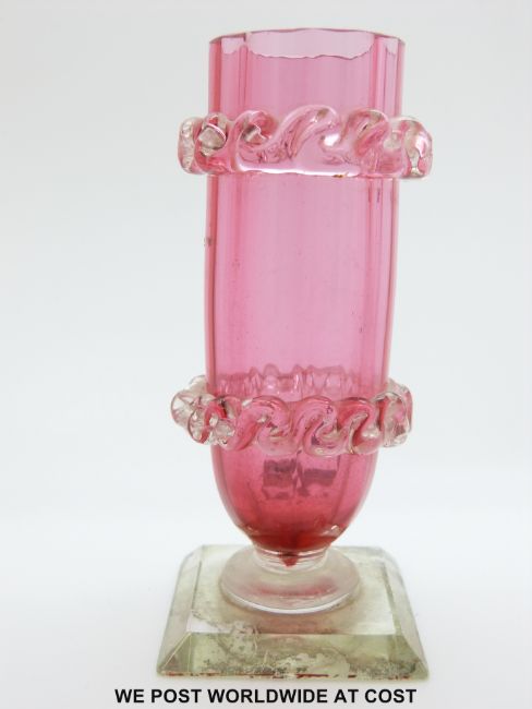 Two Victorian cranberry glasses including a Mary Gregory piece and a vase