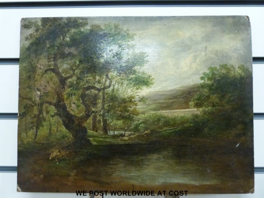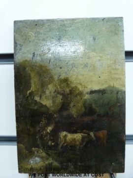 Attributed to Thomas Barker and Thomas Jones Barker of Bath: Three oil on board (two smallest on oak) of landscape scenes and cattle watering, one indistinctly signed (largest 30cm x 46cm)