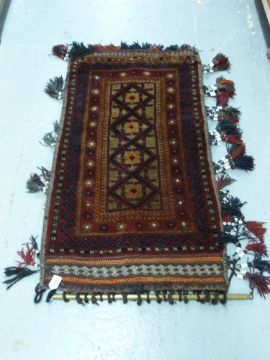 An Afghan rug with geometric design, ceramic beads and brass hanger