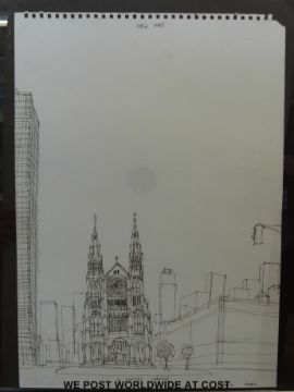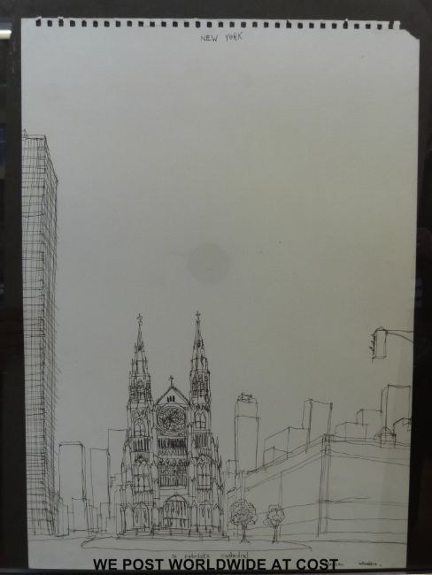 Stephen Wiltshire: Original pen illustration of St Patrick's Cathedral, New York as featured in his book "Cities". Signed & titled to lower edge 39cmx49cm with copy of original invoice from John Johnson, author's agent, 1989 and a copy of Stephen Wiltshire "Cities" book with dust jacket.