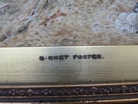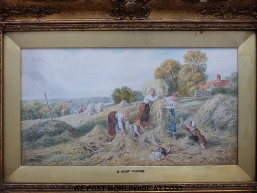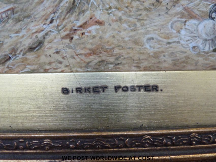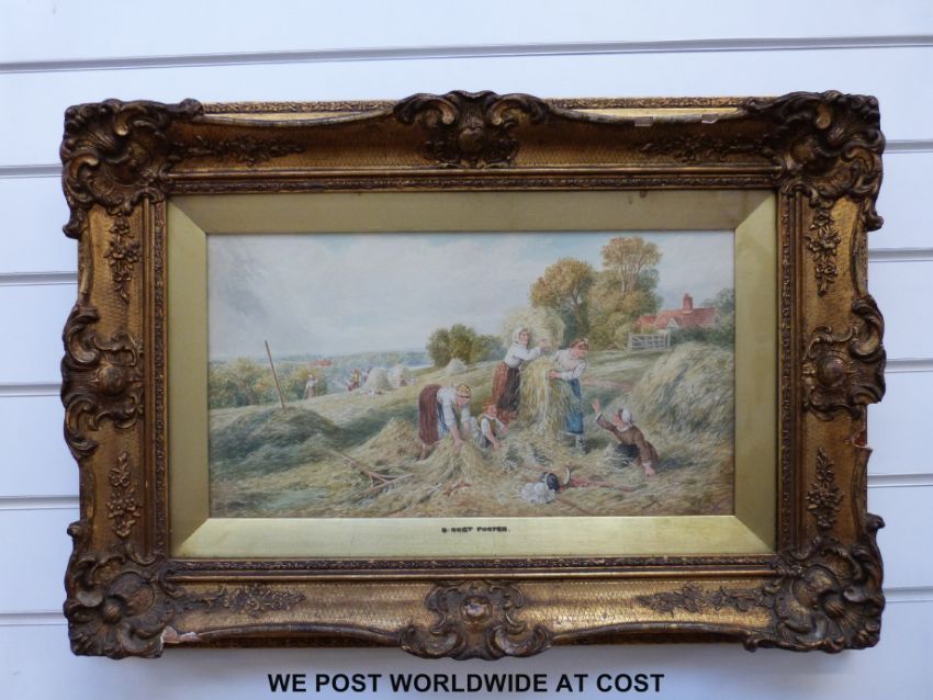 Birket Foster: watercolour, family haymaking before a cottage, monogrammed lower right (approx 24 x 45cm)