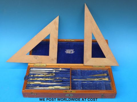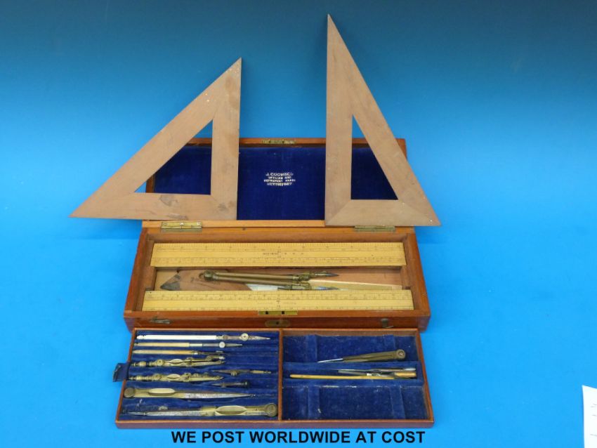 A drawing set by J Coombes instrument maker, including boxwood rulers in mahogany box together with two squares