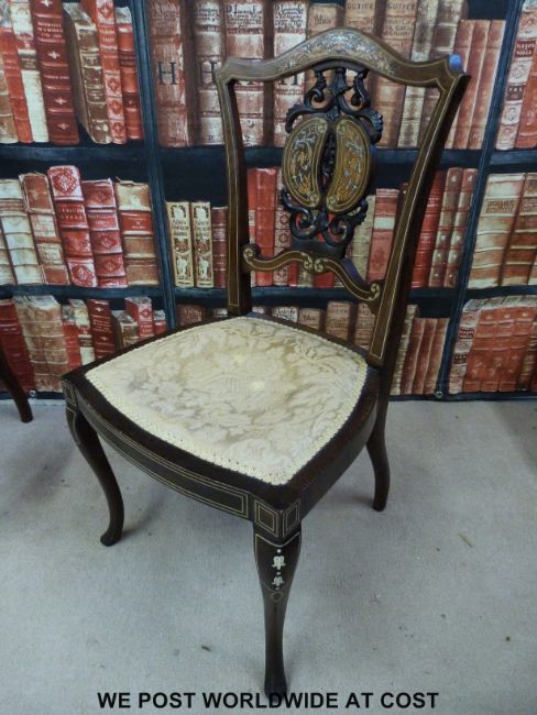 A pair of Waring & Sons 19thC inlaid mahogany salon or bedroom chairs