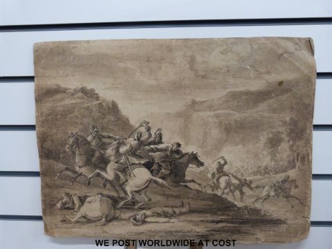 A portfolio / book of various watercolours, mainly landscapes, to include black and white watercolour battle scene signed B Barker