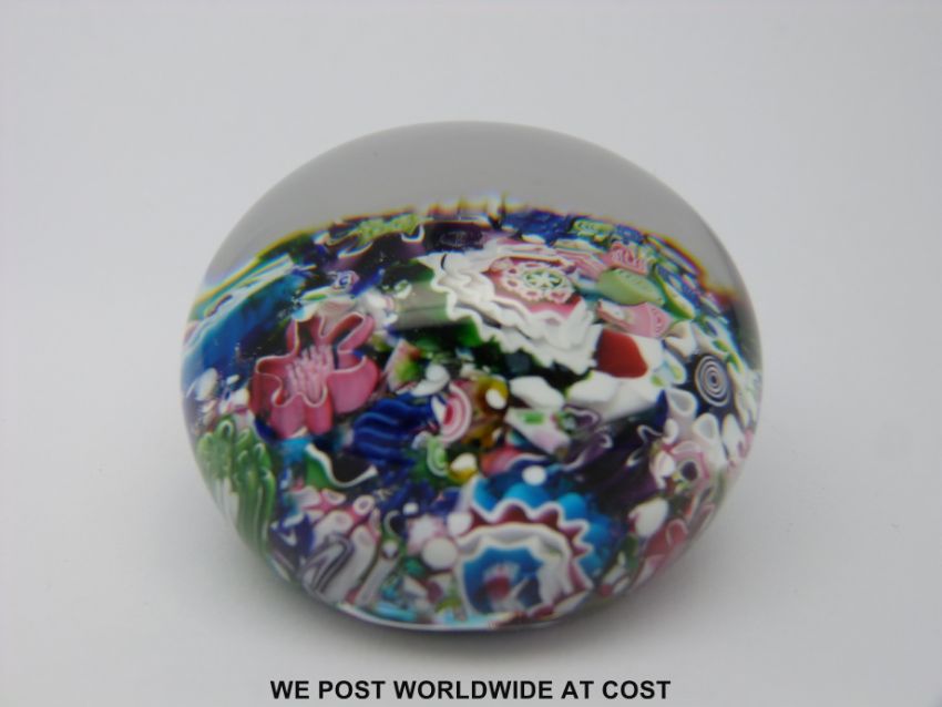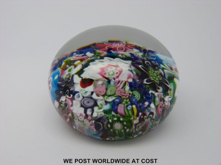 Clichy scrambled glass paperweight with various multicoloured canes, one featuring the letter 'C', 4.8cm diameter.