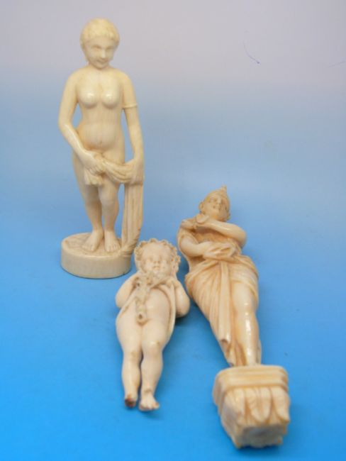 Three European ivory carvings to include a classical nude, an Egyptian and mischievous child (tallest 14cm)