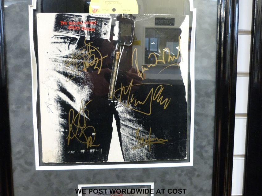 An autographed montage of the Rolling Stones album Sticky Fingers. The montage includes the vinyl record and album sleeve signed by Mick Jagger, Keith Richards, Charlie Watts, Ronnie Wood and Bill Wyman. Framed and glazed (71cm x 44cm) the title plaque with reference to the designer Andy Warhol, complete with certificate of authenticity