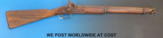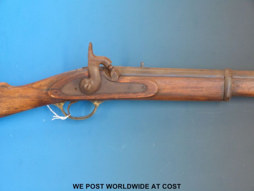 An Enfield style single barrelled, muzzle loading, hammer action gun with 21" barrel and captive ram-rod. Overall length 94 cm.