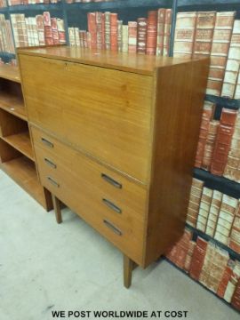 A retro bureau with three drawers below (width 92cm) together with a large bookcase.