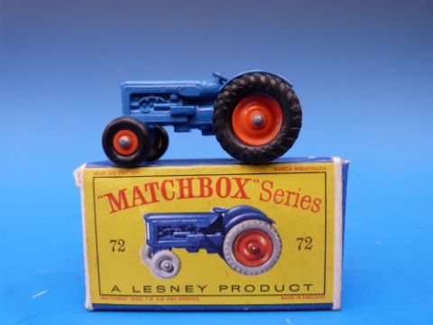Matchbox Lesney type D diecast model Fordson tractor with blue body, orange front and rear hubs and black plastic tyres no. 72, in original box