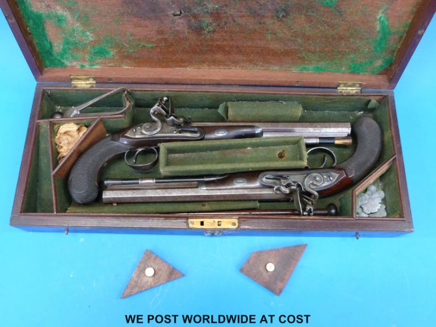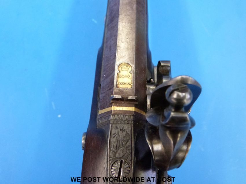 A pair of Bass 28 bore flintlock pistols with 10" octagonal, browned twist barrels with gold banding, stamped also in gold Bass, London topped with crown cypher and with inset rear and fore sights. The walnut stock with chequered grip and horn tipped forend, the lock signed Bass and fitted with scrolling engraved pan and tang. The top plate and trigger guard both ornately engraved with matching military scenes, the trigger guard with pineapple finial. Both with horn tipped ram rods, in original mahogany fitted case with accessories, overall length 39cm