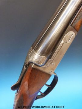 Unnamed Belgian 20 bore side by side ejector shotgun with moulded and engraved decoration, double triggers, chequered grip and forend and 28" barrels. Overall length 113 cm, serial number 2953 PLEASE NOTE THAT A VALID RELEVANT FIREARMS/SHOTGUN CERTIFICATE IS REQUIRED TO HANDLE/PURCHASE THIS ITEM.
