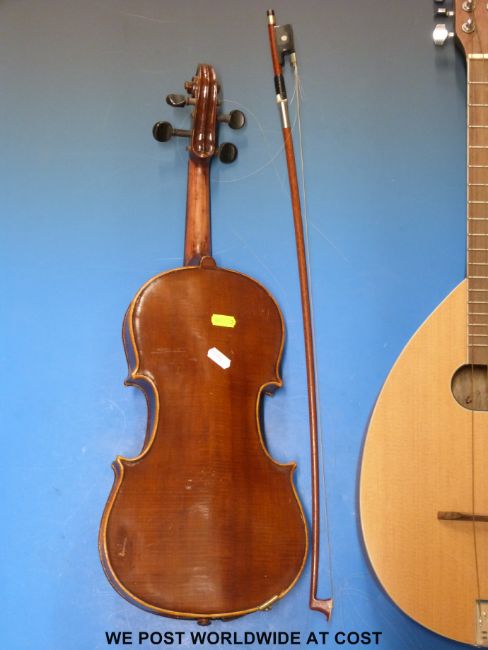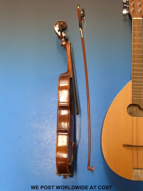 A late 20thC flat-backed mandolin together with a vintage anonymous violin with 35.5cm back and bow in case.