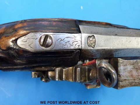 A flintlock overcoat pistol with visible Roman type lock, engraved and inlaid brass mounts, trigger guard and butt plate, wooden steel tipped ramrod and crown cypher impressed to the barrel, c1790, overall length 25cm