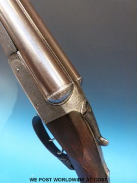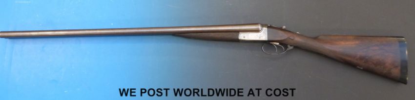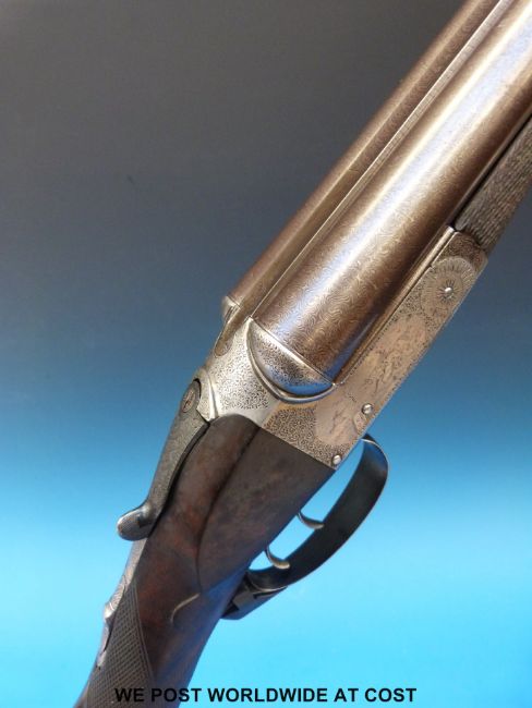George Edward Lewis 12 bore side by side shotgun with Anson & Deeley's patent boxlock action, all over engraving featuring scenes of dogs flushing birds, chequered grip, teardrop stock, vacant cartouche to underside of stock and 30" Damascus barrels named to the rib G.E. Lewis, Lower Loveday St., Birmingham. Overall length 118 cms, serial number 3937. PLEASE NOTE THAT A VALID RELEVANT FIREARMS/SHOTGUN CERTIFICATE IS REQUIRED TO HANDLE/PURCHASE THIS ITEM.