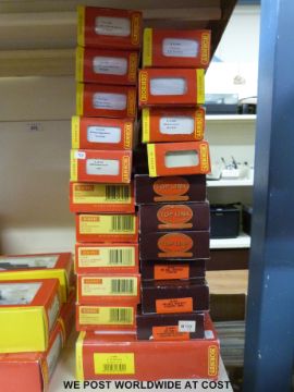 Twenty one Hornby 00 gauge carriages and wagons to include a 75 ton operating breakdown crane R6104, all in original boxes