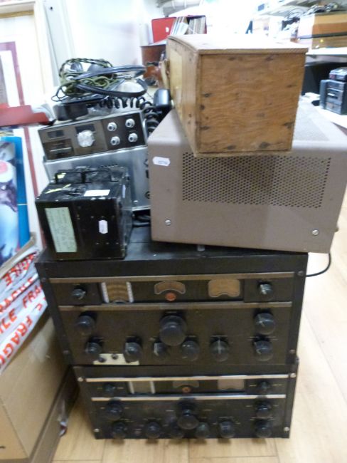Two c1930 RCA amateur radio transceiver units, models AR88LF, a boxed possible aerial base, boxed ampmeter, two large valves S807 and GEC TT21 RFZ, together with two CB radio units.