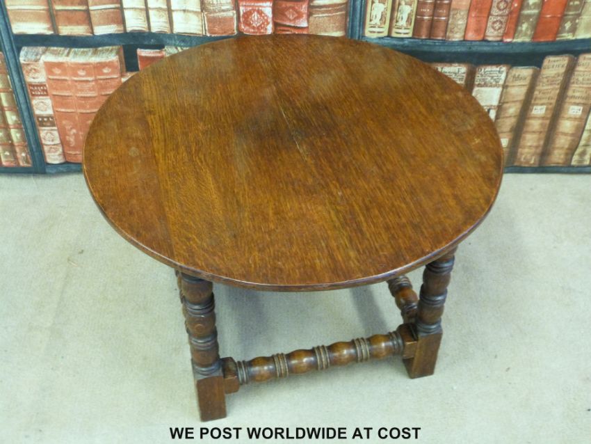 An oak circular coffee table.